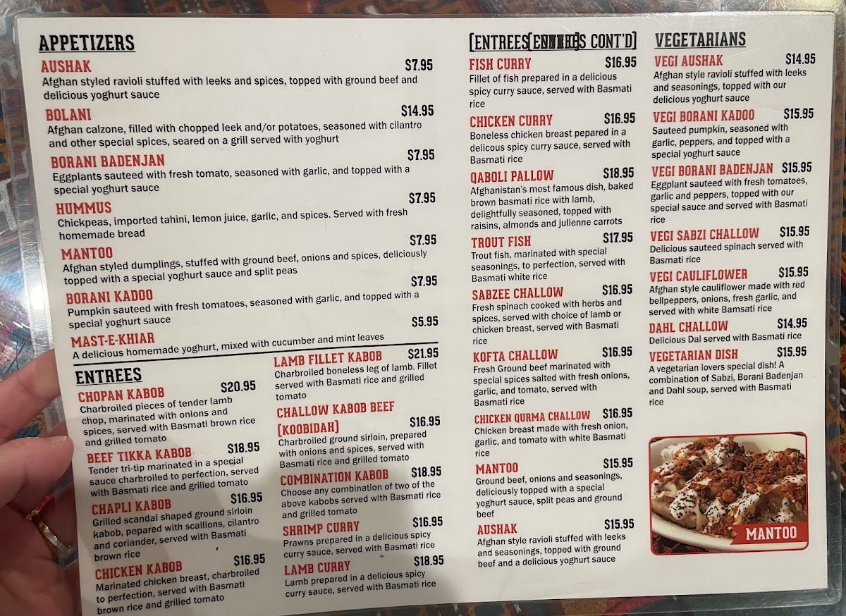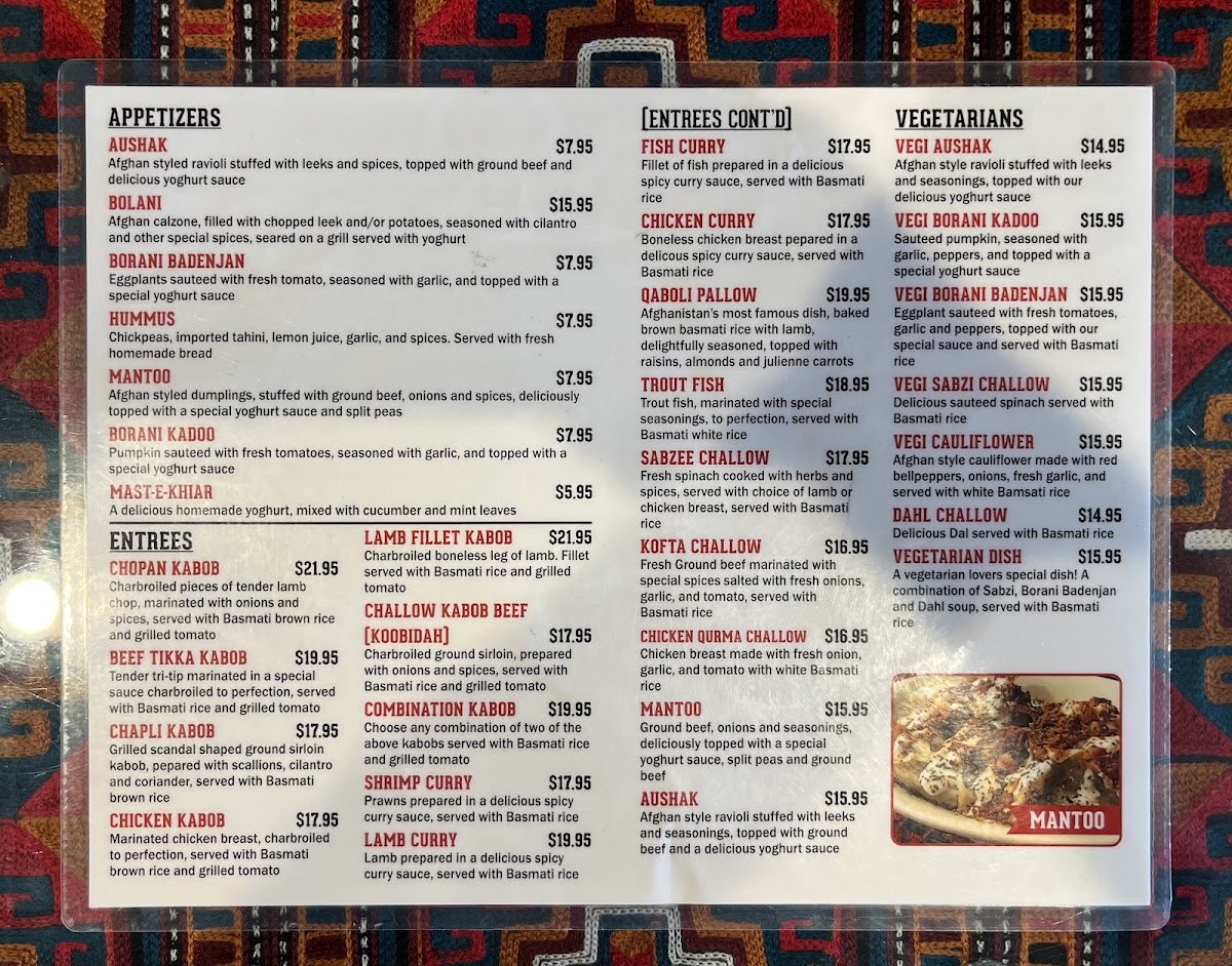 Vegetarians will also find a wealth of options here. Indulge in the Veggie Aushak, Afghan-style ravioli stuffed with leeks, or savor the flavors of the Veggie Sabzi Challow, a delightful sautéed spinach served with fluffy basmati rice, with prices starting at just $14.95. Each dish is a medley of spices and textures, with the vibrant colors on your plate promising an extraordinary meal.